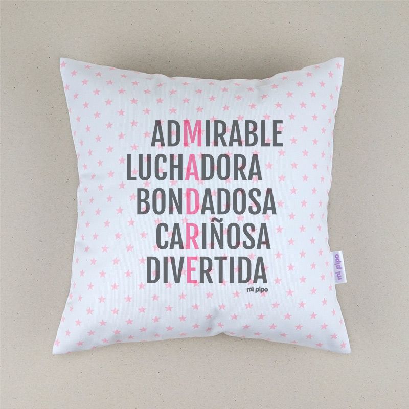 🌸 Cojín Piqué "Madre Adjetivos Rosa" – ¡Para mamás que lo dan todo y merecen descansar como reinas! 💖🛌