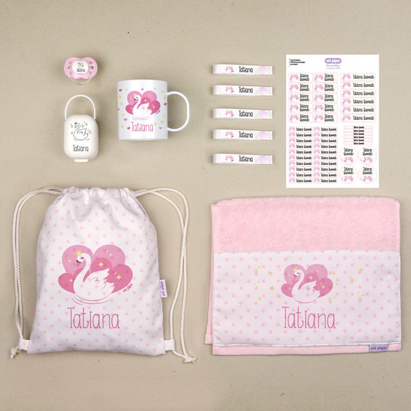 Un pack tan delicado como el batir de alas de un cisne... Diseñado para pequeñas estrellas que empiezan su aventura en la guarde o el cole, este set lo tiene todo personalizado con su nombre —con elegancia, dulzura y un toque de cuento.