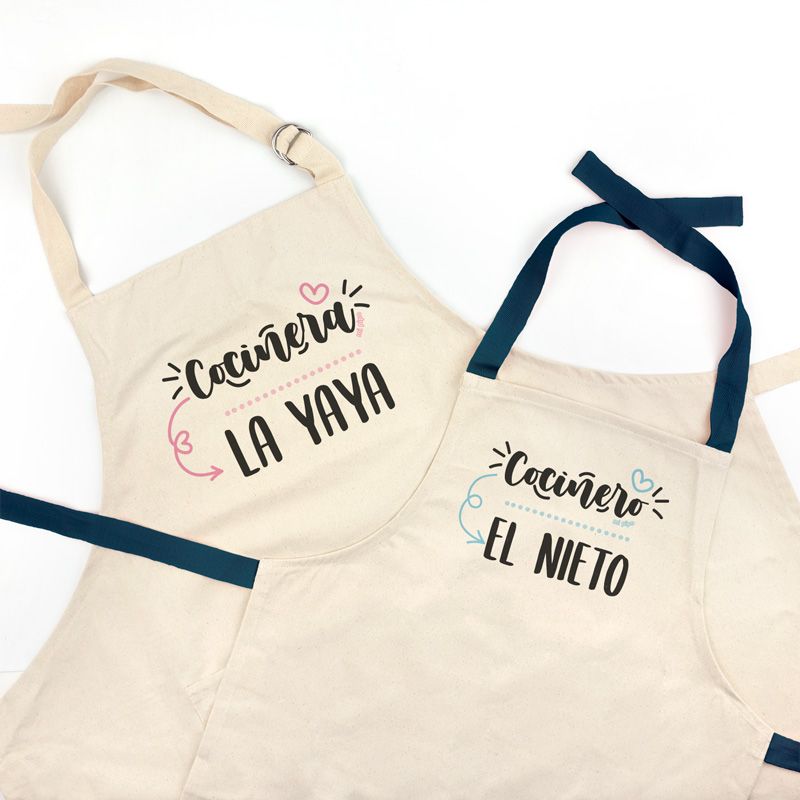 Los textos "Cocinera la Abuela" y "Cocinero el Nieto" añaden el toque especial que transforma estos delantales en algo único y significativo.