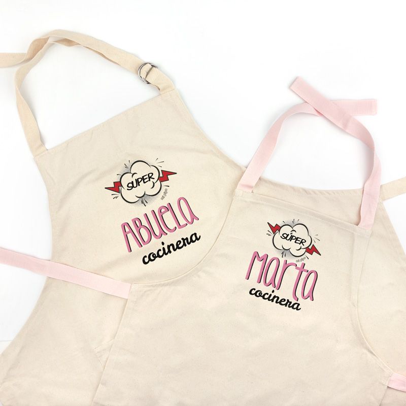 Pack Delantal Abuela y Delantal Nieto/a Rosa Personalizado Súper Abuela y Súper (nombre) cocinero