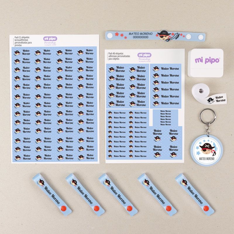 Si tu peque es más pirata que Peter Pan en una fiesta de ron sin alcohol, este pack es su cofre del tesoro. Se acabó perder chaquetas, cantimploras o la dignidad en el campamento de verano. Con este Pack Marcatodo Premium personalizado con diseño pirata, cada prenda y cada objeto gritará su nombre más alto que un loro con megáfono. Y sí, hay ¡llavero de regalo! porque somos así de generosos.